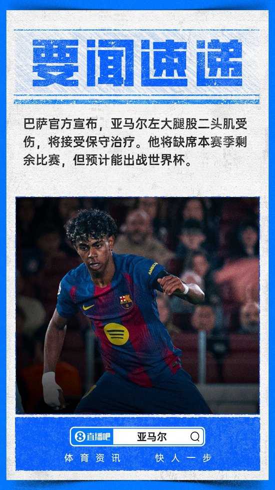 04月23日讯 巴萨官方公布亚马尔伤情,亚马尔大腿股二头肌受伤,赛季报销,预计能够赶上世界杯。